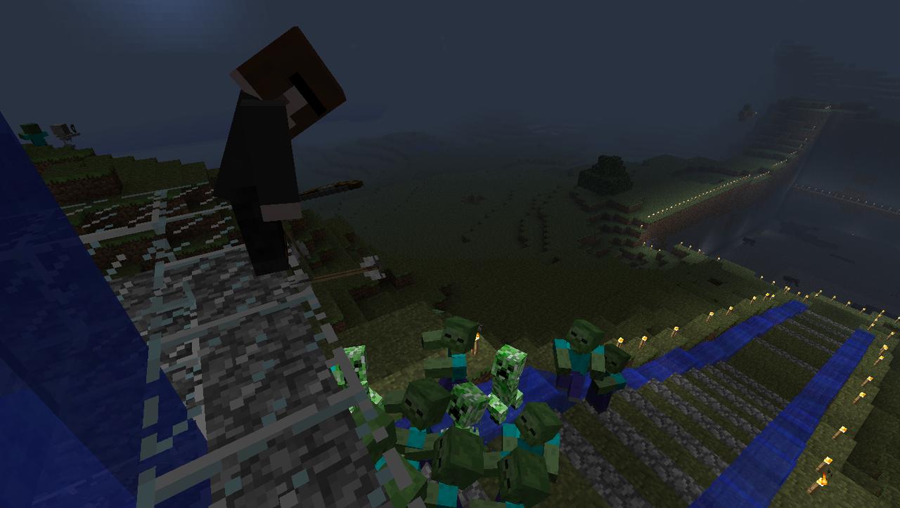 A small horde of monsters attacks our temporary building, while I look over the edge.